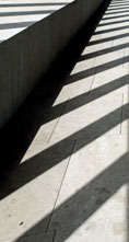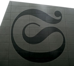 An Ein- und Mehrfamilienhäusern eines Neubaugebietes, an Hallenbad und Parkhotel entlang, komme ich nach kurzem Fußweg zur Stadthalle, an deren Längsfassade auf einer vorgeblendeten, wie angeklebt wirkenden Mauerscheibe, die, mit dunkelgrauen Platten verkleidet, schief und spitz über den eigentlichen Baukörper hinauskragt und in die rot leuchtend eingefasst vier hohe Fenstersegmente kontrastierend eingeschnitten sind, ein übergroßes, in einem noch dunkleren Grau aufgetragenes großes S in Frakturschrift meinen Blick unwillkürlich auf sich zieht und für Momente festhält. |