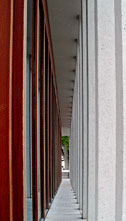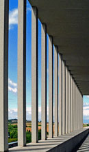 Auffälliger als jene ist ein mehr oder weniger in der Flucht der Stadthalle in der Sonne weiß aufstrahlender (post-)moderner Gebäudekomplex: das »Literaturmuseum der Moderne« (kurz auch als »LiMo« bezeichnet – nicht Limo!), dessen Eingangspavillon auf dem einer Terrasse ähnlich gestalteten Dach des weit ausladenden, an den Hang der Anhöhe gelegten Sockelgeschoss aufsitzt und das klassisch antike Architekturelement des umlaufenden Säulengangs (des Peripteros) aufgreift[1]. |