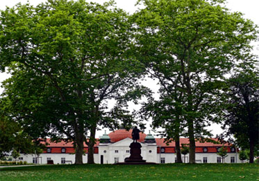 Da steht er, dem »weltweit so viele Denkmäler gewidmet«[4] worden sind wie keinem anderen Dichter[5], in einer seinen Namen tragenden Parkanlage auf einem hohen, aus rotem Sandstein klassisch gefertigten Postament, umgeben von vier wuchtigen, weit ausladenden Platanen, die je an den vier Endpunkten der über die zweistufige Bodenplatte, auf dem das Denkmal[6] ruht, hinaus verlängerten Diagonalen mit ihrem dichten, Schatten spendenden Blätterdach stehen, und blickt – dabei dem sich ihm langsam über den Wiesenplatz nähernden Besucher den Rücken zugekehrt – auf sein eigenes[7], nur ihm zu Ehren erbautes, 1903 feierlich eingeweihtes, einem »pantheonartigen Lust- und Jagdschlösschen«[8] ähnelndes und 2009 nach umfangreicher Komplettsanierung wieder eröffnetes[9] Museum, das sich seit 1922 sogar »Schiller-Nationalmuseum« nennen darf! |