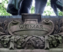 Auf der rückwärtigen, also Schiller abgewandten Denkmalseite sind über einer stilisierten Girlande (einem Feston) der Stadtname Weimar zu lesen, darunter in einem durch Blattwellen (dem lesbischen Kyma) und Perlstab (dem Astragal) eingefassten quadratischen Feld die (be-)deutungsvollen Verse »Er glänzt uns vor, wie ein Komet entschwindend, / Unendlich Licht mit seinem Licht verbindend.«[10].