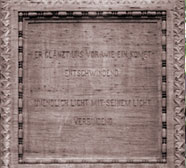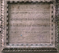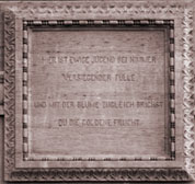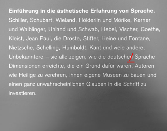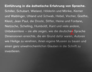 Auf einem mitten im großen »Festsaal der Literatur« (wie dieser Raum überschwänglich genannt wird) stehenden, postmodernistisch zum neobarocken Ambiente kontrastierenden, monolithisch wirkenden Block ist in weißer Schrift auf steingrauem Untergrund Folgendes zu lesen: |