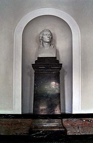 | Leicht amüsiert infolge meines Anflugs von Irritation überquere ich den Vorplatz und betrete durch die Tür eines Vorbaus das Museumsgebäude. In dessen neobarocker Eingangshalle steht in Blickrichtung über dem Treppenaufgang in einer durch einen Bogen überfangenen, weißgerahmten Mauernische auf schwarzmarmornem Sockel – wie könnte es auch anders sein – die strahlendweiße Büste Schillers, dem eigentlichen Hausherrn (den ich selbstverständlich und geradezu touristenlike sofort ablichte!), und empfängt in die Ferne blickend seine Besucher. |