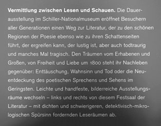Das einerseits nach neuesten bauhistorischen Befunden außen wie innen behutsam und innenarchitektonisch wie museal nüchtern reflektiert restaurierte Schillerhaus, ohne dabei einem zwanghaft historisierenden Wiederherstellen einer nur vorgespielten angeblichen Authentizität im Hinblick auf Mobiliar, Inneneinrichtung, Haushaltsgegenstände zu verfallen, lässt andererseits das alltägliche Leben mit seinen vielfältig ge- und erlebten Mühsalen und Nöten der Familie Schiller nur mit viel, sehr viel Vorstellungskraft und Einfühlungsvermögen, gleichsam in einem inneren Film, nachempfinden. Dennoch erlaubt »die neue Ausstellung mit ihrer ebenso zurückhaltenden wie klaren Gestaltung (...) von den außergewöhnlichen Vitrinen über die detaillierte Lichtplanung bis hin zu der konsequent verwendeten modernen Schrift«[18] gerade durch den bewusst gestalteten Kontrast eine Begegnung aus einer – nach meinem Verständnis – zeitlich notwendig einzunehmenden Distanz. |