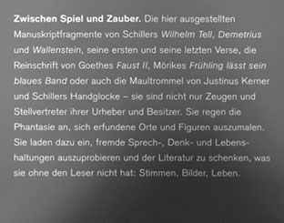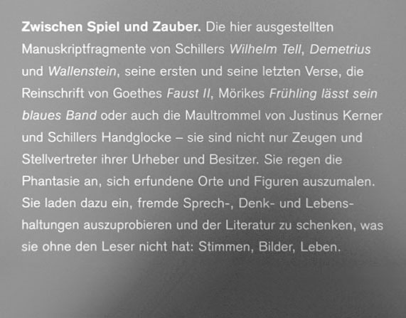 Allerdings beeinträchtigt das nicht meinen Gesamteindruck von der ausgezeichnet gestalteten und inhaltlich sehr detailreichen Dauerausstellung zu Leben und Werk Schillers. Die für die Präsentation der Exponate gewählte Lichtgestaltung im Zusammenspiel mit den bewegten Wandprojektionen erzeugt eine eindrucksvolle Atmosphäre und erlebbare Dichte.