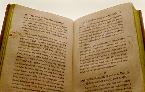 Vor mir liegt in einer Vitrine ein Exemplar von Immanuel Kants »Critic der Urtheilskraft« von »1790/91, Berlin: Libau; aus Schillers Bibliothek mit seinen Anstreichungen« – wie einer Tafel zu entnehmen ist.